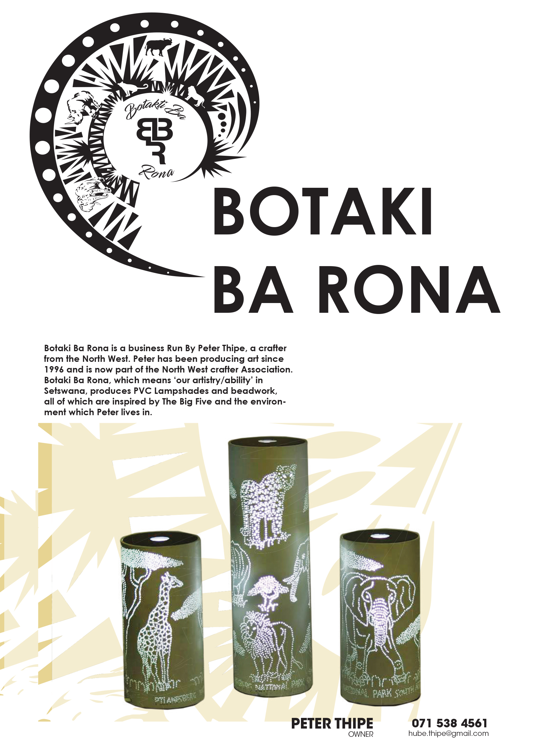 The Bokone Bophirima Craft and Design Institute (BBCDI) was set up in 2009 to promote and grow craft and design as an economic sector in the North West Province of South Africa. A Non Profit Company, the BBCDI, followed the engagement by the Department of Trade & Industry Creative Industries Sector Desk, a process of developing a Trade and Enterprise Development Strategy for the craft sector. A Customised Sector Programme (CSP) for Craft was completed in July 2005 and has since been used as the conceptual framework for the implementation of the craft programmes and activities both nationally and provincially. The Department of Trade & Industry (the DTI) approved the CSP in February 2007 where the Integrated Craft Hubs were identified as the key action programme pivotal to the success of the strategy. The CSP and more particularly the implementation of the Craft Hubs have since been incorporated into the National Industrial Policy Framework and its Action Plan. The BBCDI is therefore a hub, established in line with the National Craft Sector Programme, Craft Hub Blueprint and the Industrial Policy Action Plan as approved by parliament in 2007.